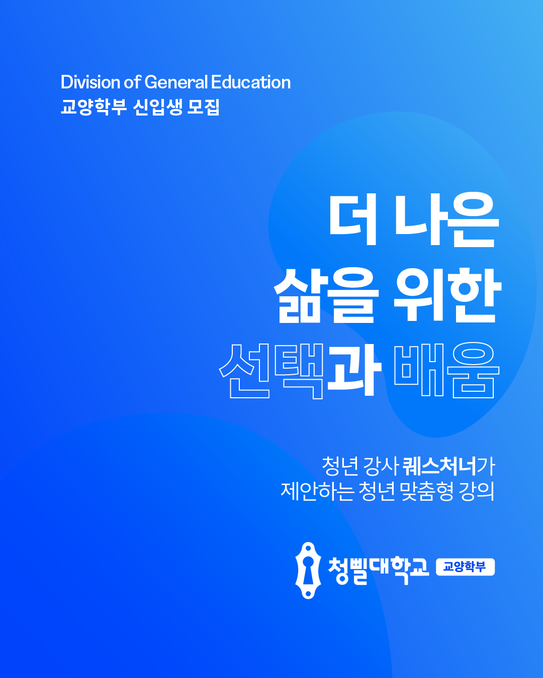 마음에 교양을 쌓고 싶은 청년이라면? 청삘대학교 교양학부 ✨2025년 청삘대학교 가을-겨울학기 교양학부 신입생 모집✨ ✨청삘대학교란? 서울청년센터 금천 청춘삘딩이 운영하는 청년을 위한 시민대학 프로그램입니다✨ 🤝교양학부란? 일하느라 오늘도 지쳐버린 내 몸,, 일에서 성장하는 것도 좋지만 더나은 나의 삶을 선택하고 배우고 싶은 청년들을 위해 준비했습니다. 청년이 살아가는데 필요한 지식과 기술, 생애역량을 배우고 실천하며 더 나은 삶을 설계할 수 있도록 돕습니다. 퀘스처너는 청삘대학교 교육학과를 이수한 청년 강사를 뜻합니다. 청년 강사 퀘스처너가 제안하는 청년 맞춤형 강의를 소개합니다! ✨교양학부 과목 ✔️선택-1 : 나를 연애하게 하라!-나로부터 시작하는 연애와 관계 ✔️선택-2 : Be kind to yourself ✔️선택-3 : 식집사 고민 상담소 ✔️선택-4 : 나와 우리, 건강한 관계를 위한 용기 ✔️선택-5 : 사람보다 AI가 편한 나, 괜찮은 걸까? - 연결은 귀찮고, 단절은 무섭고 ✔️선택-6 : 디자인 몰라도 OK! 피그마로 만드는 나만의 명함&카드뉴스 ✔️선택-7 : 말하지 못한 감정으로 쓰는 당신만의 독백극 ✨참여 대상 - 어디서도 배우지 못한 삶 기술을 배우고 싶은 청년 - 일이 아닌 나의 삶을 고민하고, 살아보고 싶은 청년 👇 자세한 내용 확인하기 https://www.univccbd.com/1177711416 💙 수강신청기간 - 교양학부 수강신청 기간 : 2025.09.30.(화)~각 프로그램 시작 5일 전까지 💙신청방법 https://tally.so/r/mR9Blv > 신청서 제출 > 보증금 입금(이수 시, 전액 환급) > 참여 확정 문자 전달 💙 문의사항 📞담당자전화 : 02-864-0597