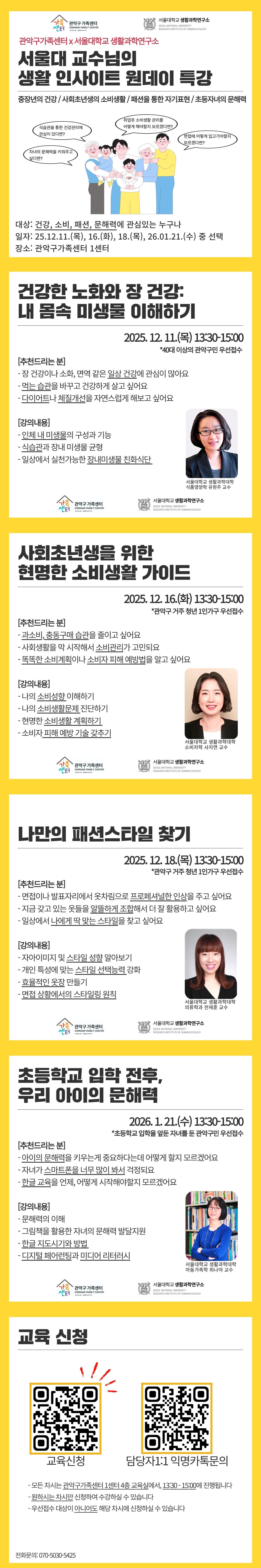 〈서울대 교수님의 생활 인사이트 원데이 특강〉는 서울대학교 교수님을 직접 모시고, 건강생활/소비생활/패션/문해력을 주제로 총 4회의 특강으로 진행됩니다.