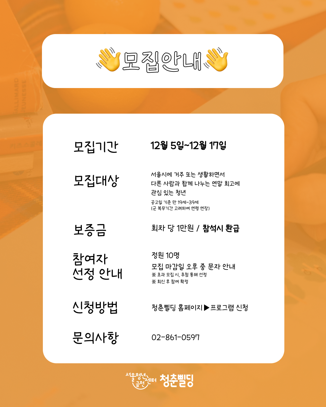 👋 신청방법: 청춘삘딩 홈페이지 로그인-> 기관소개-> 프로그램 신청