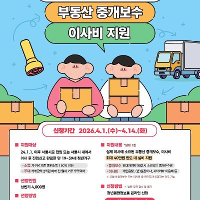 이사가 잦은 청년 가구의 주거비 부담을 덜어주기 위해 '2026년 청년 부동산 중개보수 및 이사비 지원사업'에 함께할 청년을 다음과 같이 모집하오니 많은 관심과 참여 바랍니다.