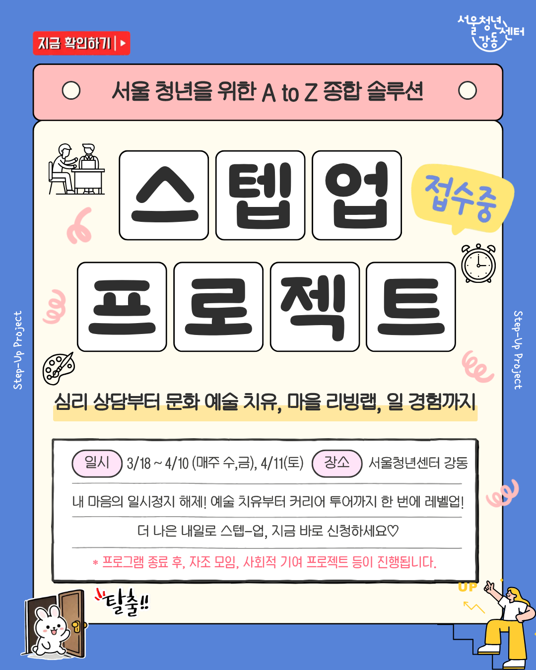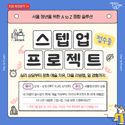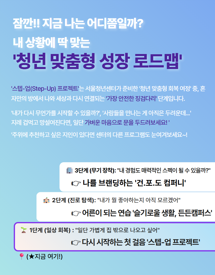 - 가벼운 산책과 문화 활동을 통해 세상 밖으로 나아갈 준비(Step-Up)를 하고 싶은 청년