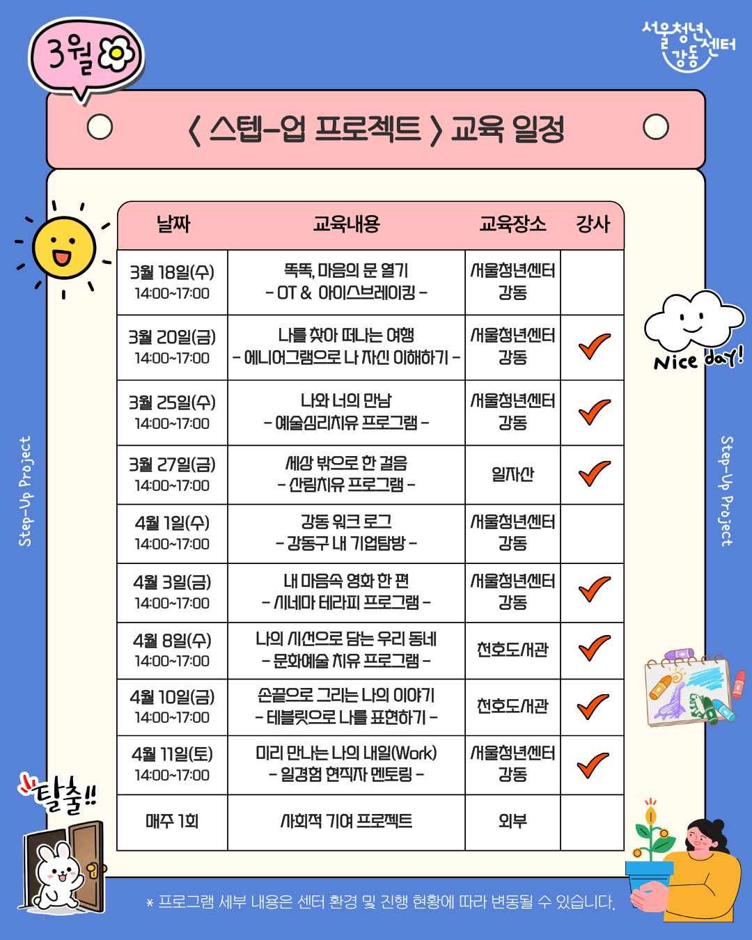 - 모든 프로그램은 10분 지각 시 입장 불가합니다. 다음 회차에 참여하기 위해 대기하는 다른 청년을 위해 꼭 시간 맞춰 방문해 주세요!!!