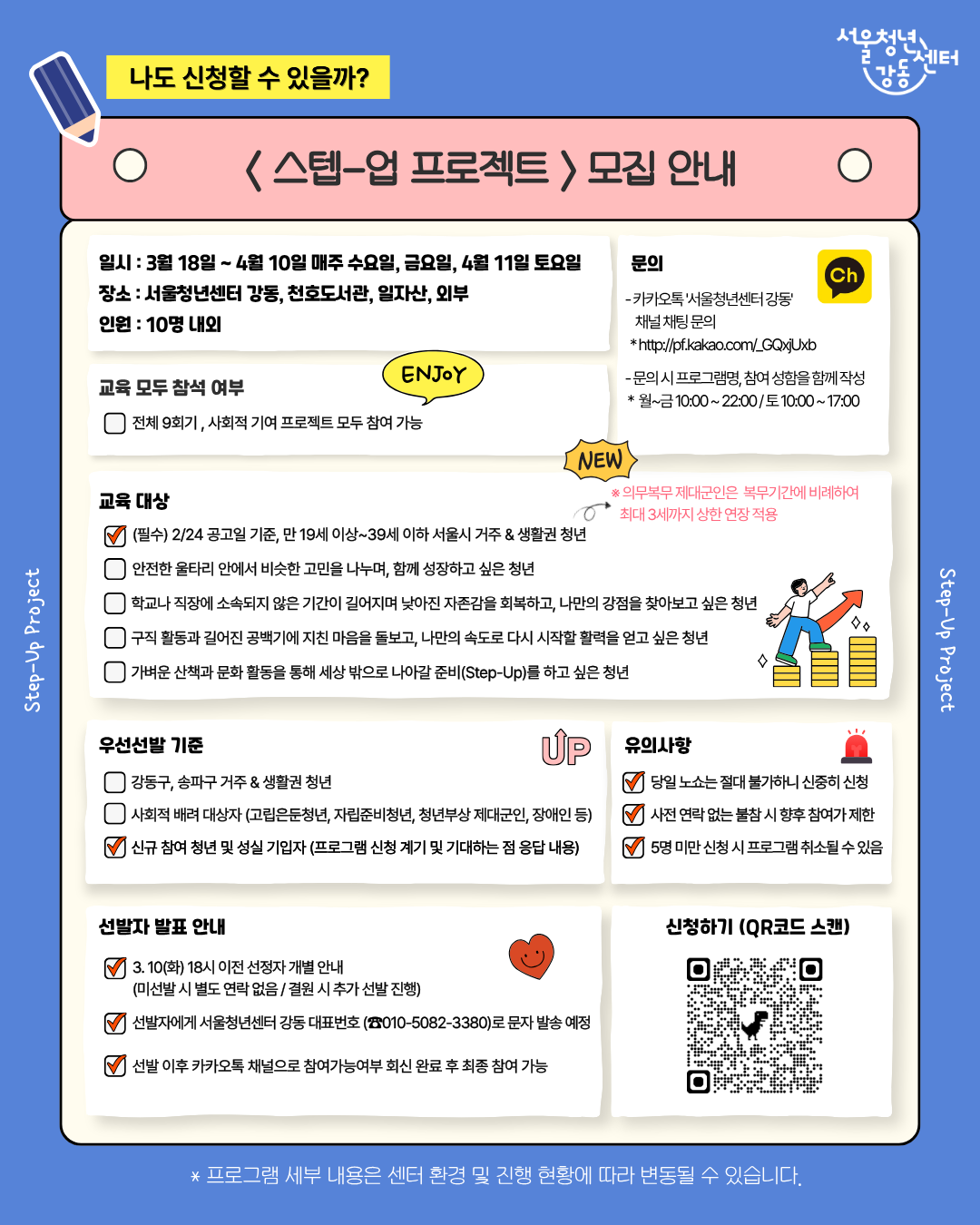 - 카카오톡 '서울청년센터 강동' 채널을 통해 채팅 문의 가능합니다. ▶ http://pf.kakao.com/_GQxjUxb