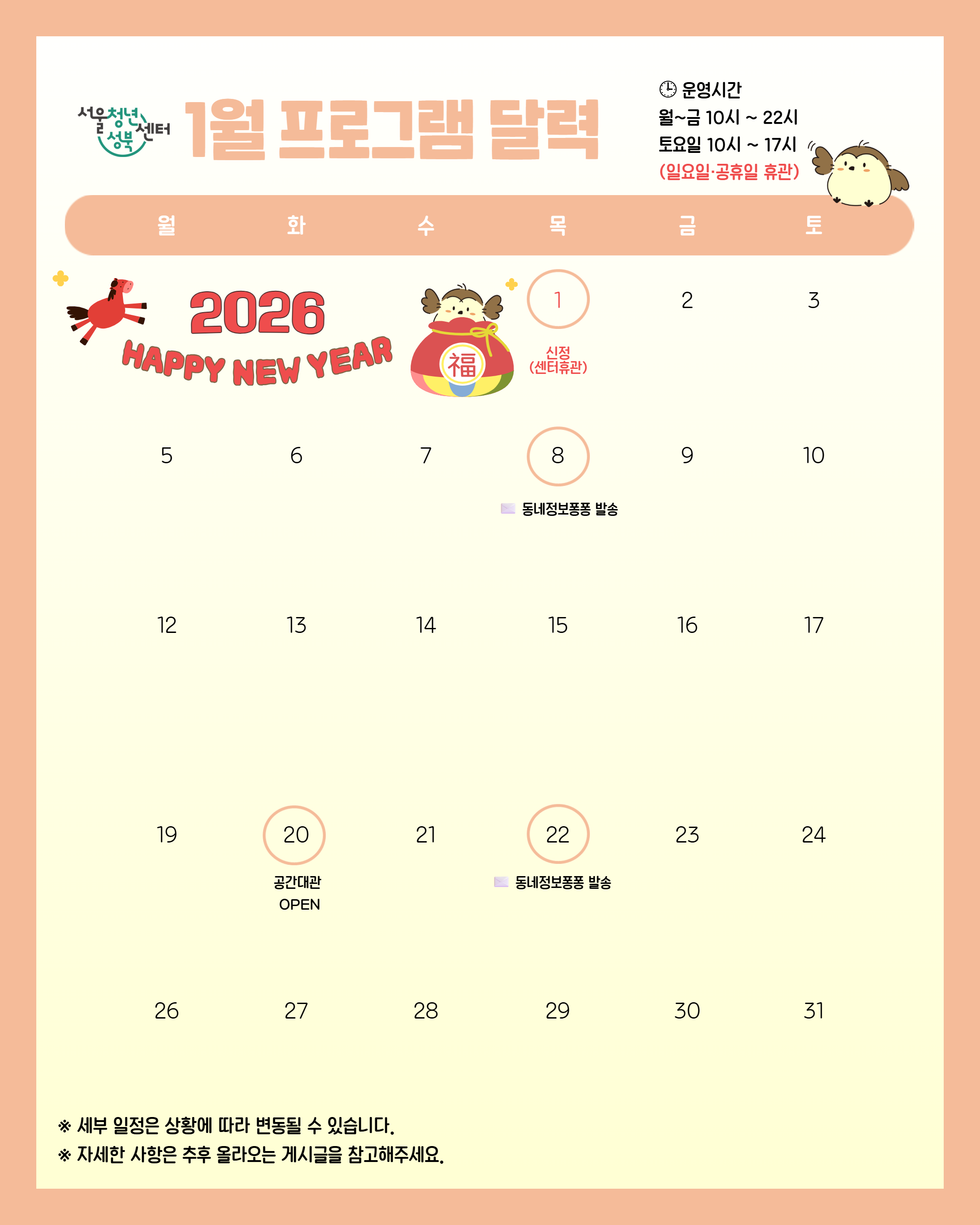 2026년 1월 프로그램 및 휴관 서울청년센터 성북 일정 안내 드립니다!