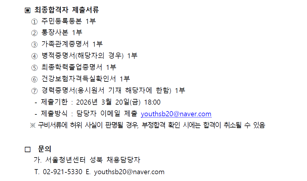 2026년 서울청년센터 성북 제1차 청년지원매니저 채용 심사 결과 공고(출산휴가 및 육아휴직 대체)