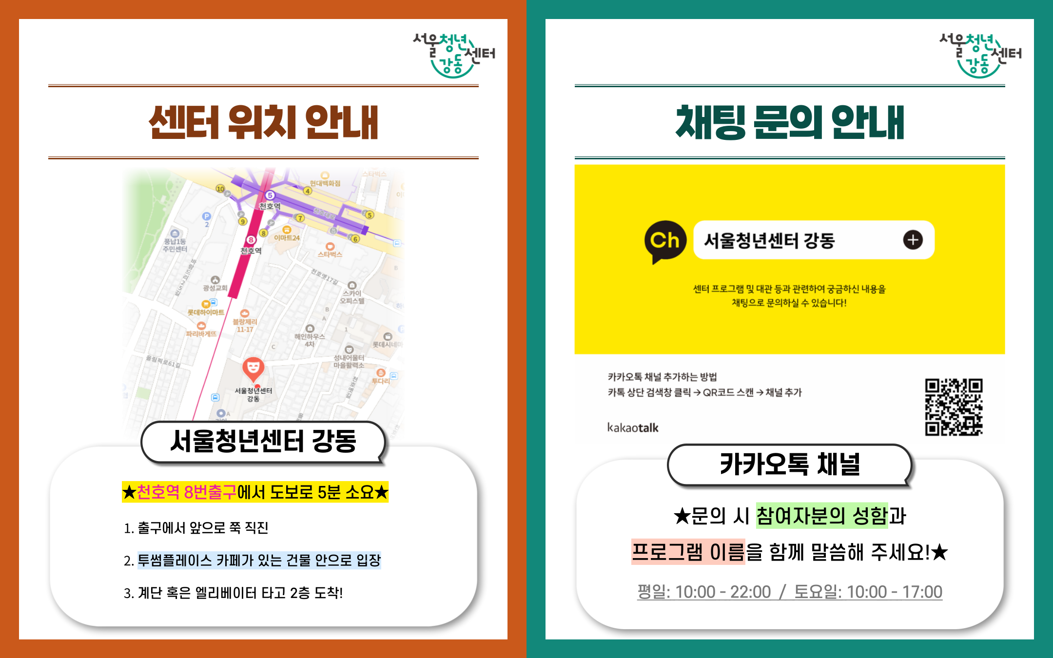 저희 서울청년센터 강동은 강동구 청년해냄센터와 같은 층을 사용하고 있습니다.