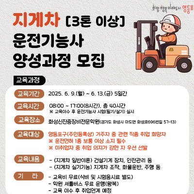 ... 필수조건: 1종 보통 운전면허증 소지자 ㅇ 모집기간: 2025....후 마들근린공원.노원에코센터 하차) ㅇ 교육문의: 기술교육원 북부캠퍼스(☎ 02-2092-4800, 4853) ㅇ 기타문의: 도봉구청 지역경제과(☎ 02-2091-2863)